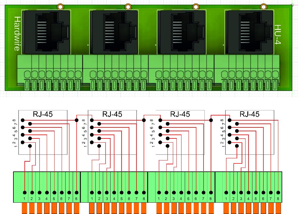 Клемник HU-4 — 4×RJ45 до натискних клем на DIN-рейку